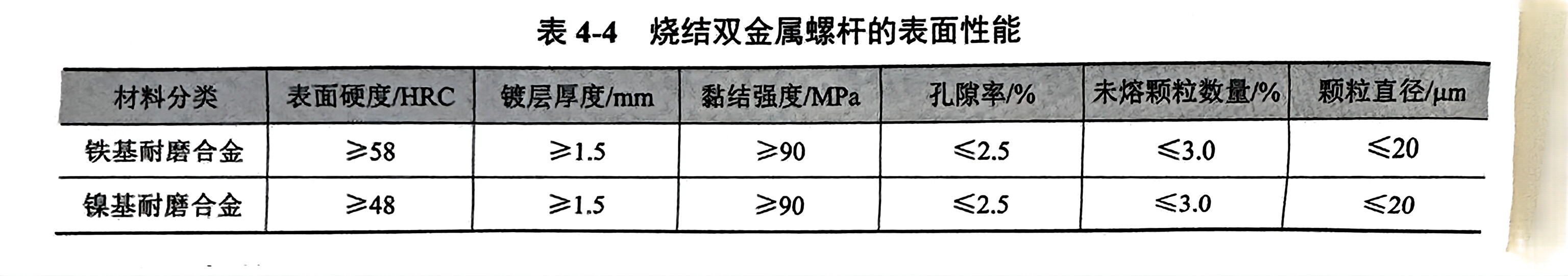 (2) 螺杆 滲 钢的螺杆工作表面应进行氮化处理,氮化层深度不小于0.4mm:螺杆外圆氮化硬度不低于840HV;脆性不大于2级。烧结双金属螺杆的工作表面性能应符合表4-4 的规定。采用镀硬铬的螺杆,镀层厚度不小于 0.06mm,其硬度不低于 750HV,黏结强度和孔隙率应符合 GB 11379 的规定。