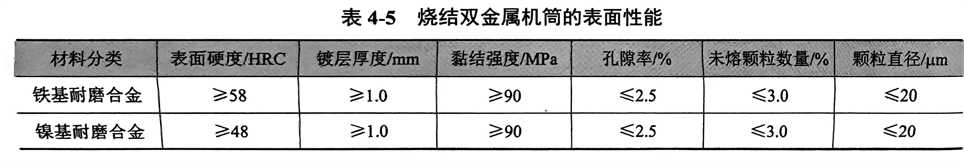 挤出工艺中渗氮钢的机筒内孔表面应进行氮化处理,氮化层深度不小于 0.4mm;机筒工作表面氮化硬度不低于940HV;脆性不大于2级。烧结双金属机筒的表面性能应符合表4-5的规定。
