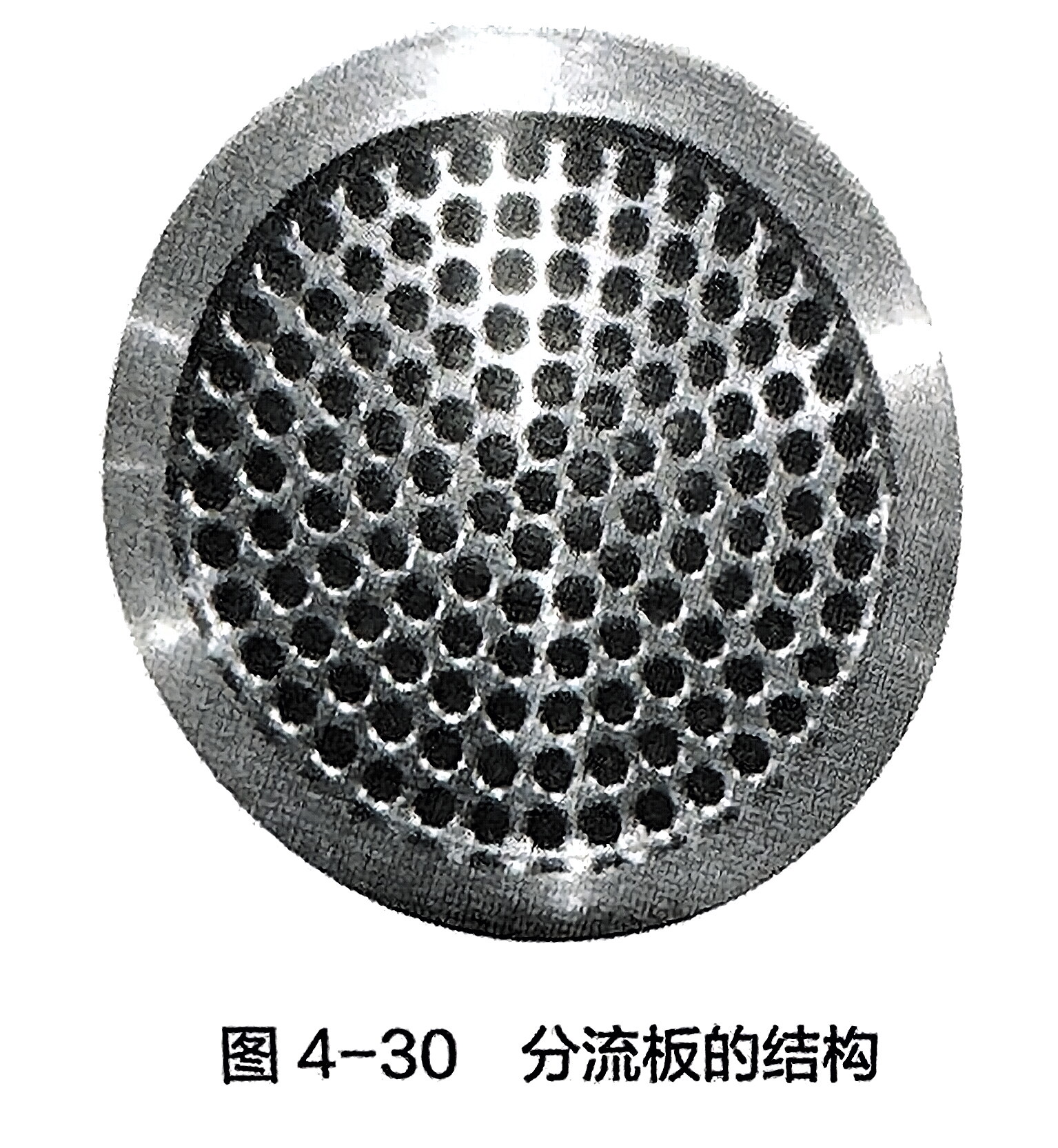 挤出工艺中分流板(又称多孔板)和过滤网通常设在机筒和机头的连接处,其作用是使物料由旋转运动变为直线运动;阻止金属等杂质和未塑化的物料进入机头;改变熔体压力,以控制塑化质量。(1)分流板的结构与材料 分流板有各种形式,目前使用较多的是结构简单、制造方便的平板式分流板,如图4-30所示。为使物料通过分流板之后的流速均匀,常使孔的分布为中间疏,边缘密,孔的大小通常是相等的,其直径一般为2~7mm,并随螺杆直径的增大而增大。为了有利于物料的流动和分流板的清理,孔道应光滑无死角,并在孔道进料端要倒出斜角。分流板