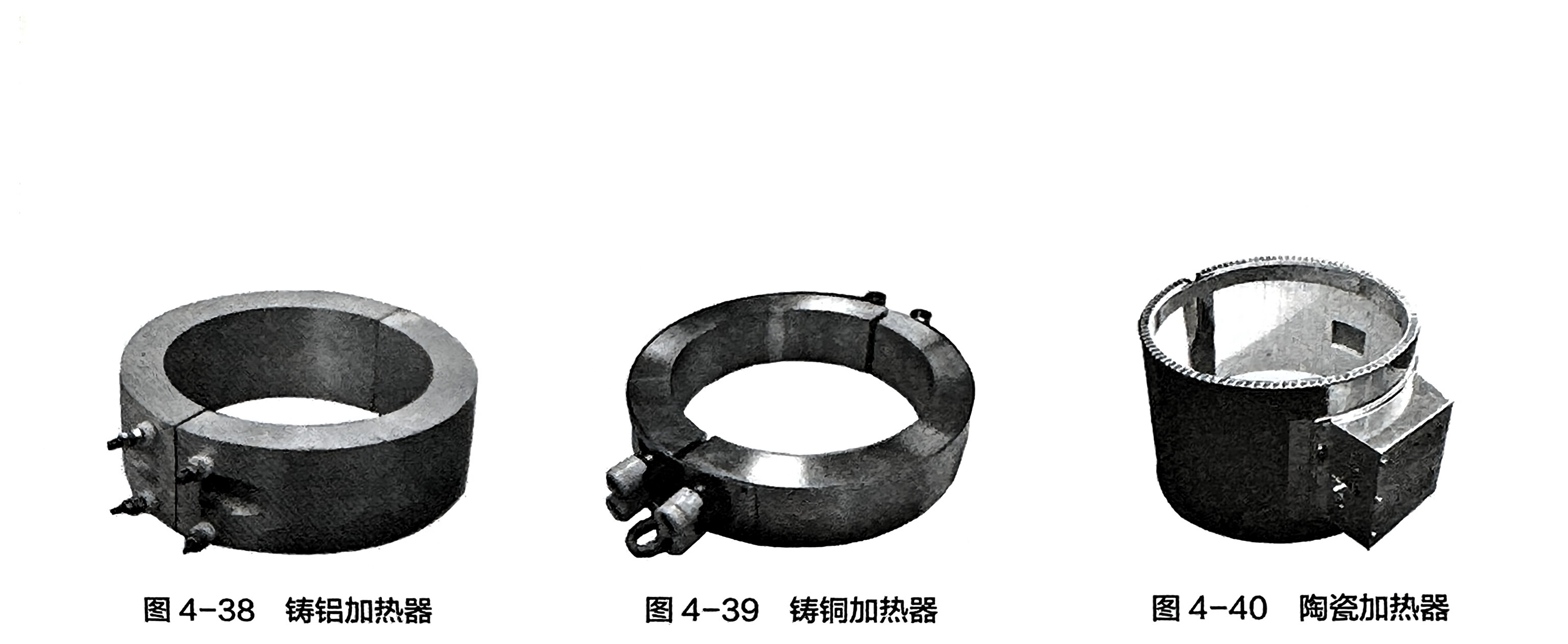 (1)电阻加热器 电阻加热器的原理是利用电流通过电阻较大的导线产生大量的热量来加热机筒和机头。这类加热器最常见的是带状加热器、铸铝加热器和陶瓷加热器。