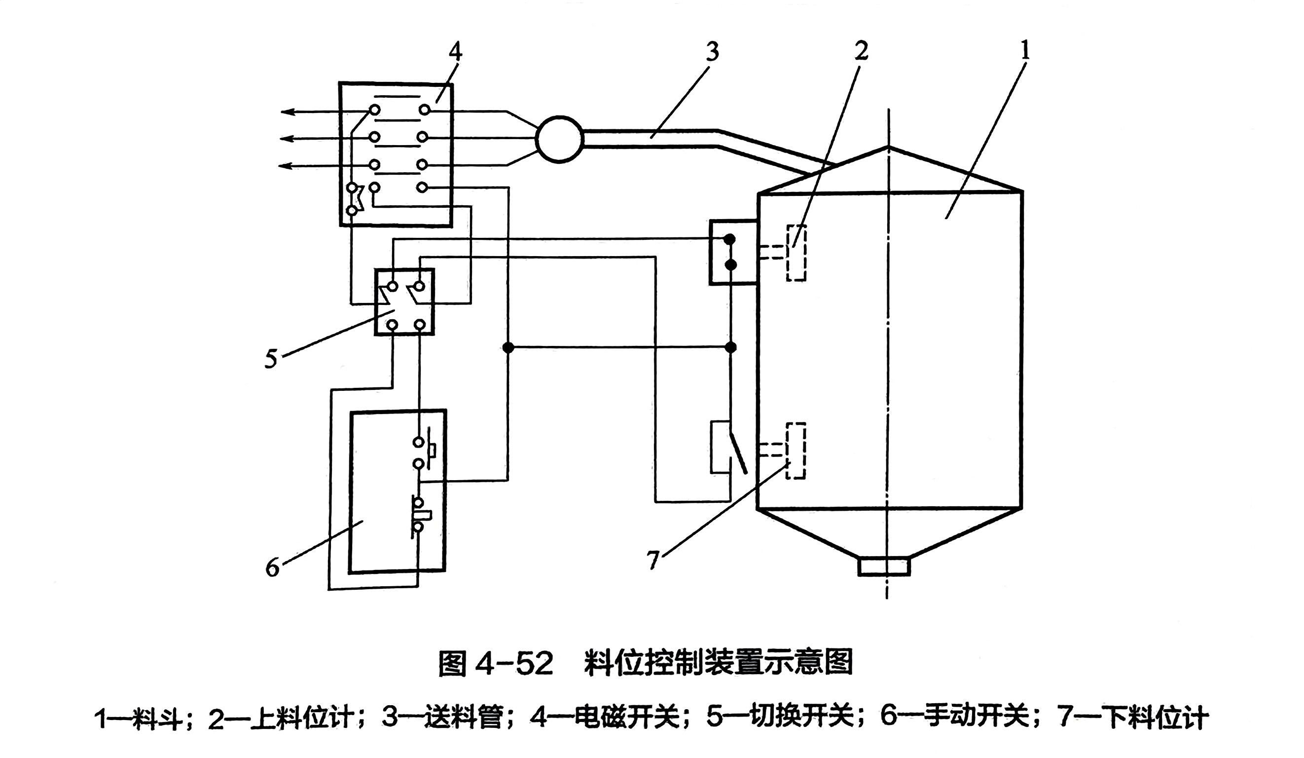 为改善重力加料效果,较有效的办法是在料斗中设置料位控制装置,使料斗中的料位高度能保持在一个适度的范围内。图4-52所示即为一种设有料位控制装置的加料斗,可以看出,当料位超过上料位计时,上料装置便会自动停止上料,而当料位低于下料位计时,上料装置则自上料。