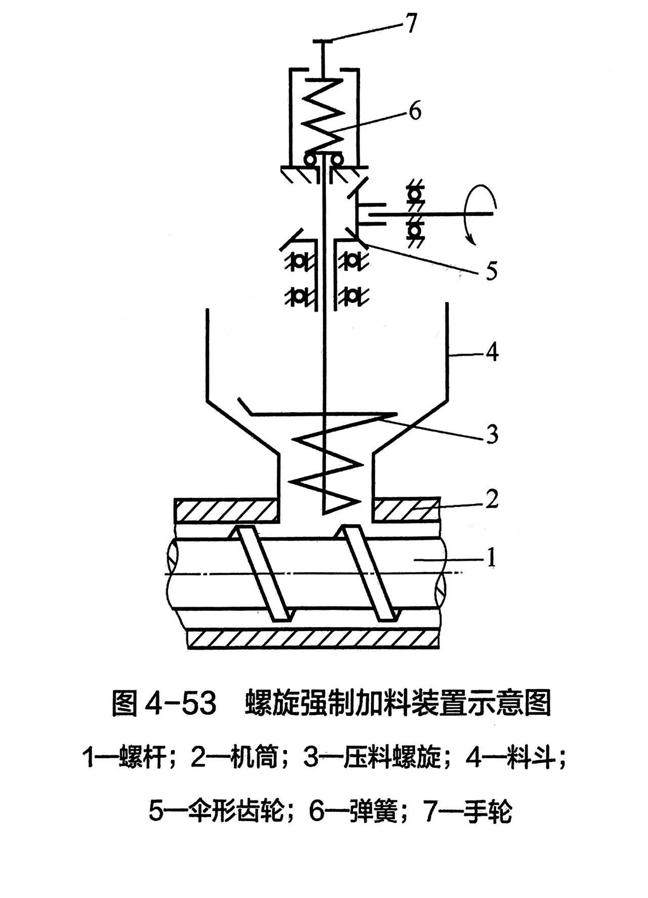 这种加料装置还设有过载保护,当料流压力增加或机筒进料口被堵塞而使压力超过弹簧6的弹性力时,则压料螺旋就会自动上升,而不会将物料硬往进料口中挤,从而避免强制加料的压料螺旋损坏。