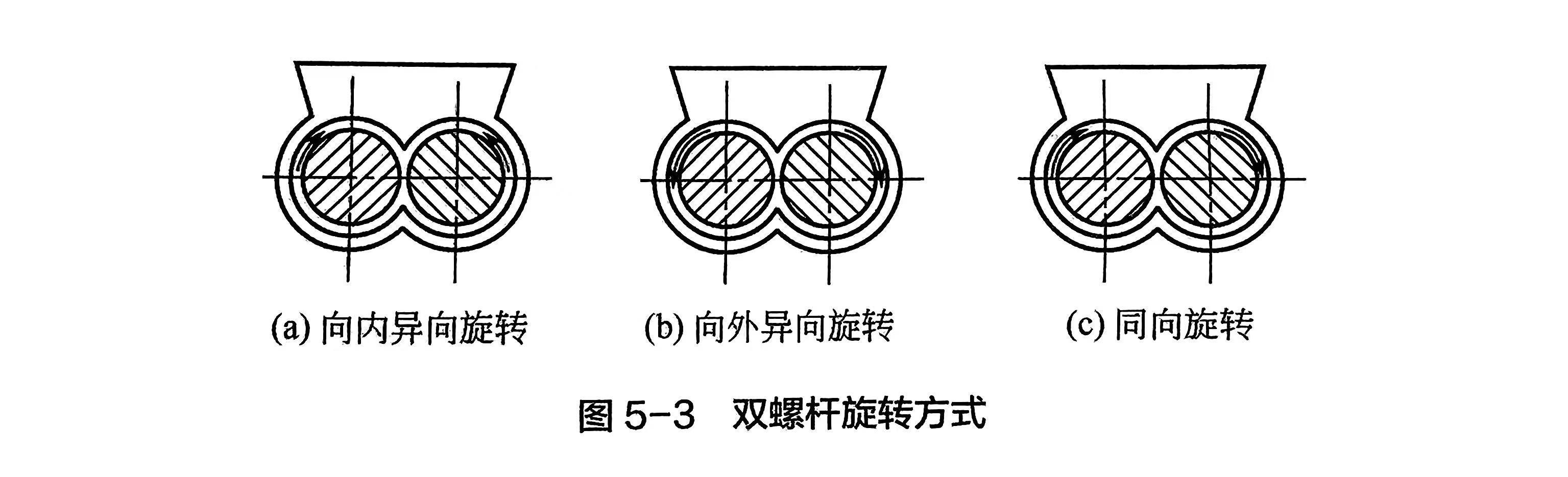 异向旋转型的两根螺杆的几何形状对称,螺棱旋向完全相反。异向旋转双螺杆又分为向内星向旋转和向外异向旋转,如图5-3(a)、(b)所示。同向旋转型的两根螺杆旋转方向一致,如图5-3(c)所示。