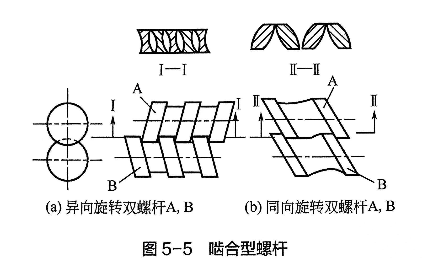 双螺杆挤出机的工作原理同样包括物料的输送与压缩、熔融塑化、排气、混合和均化等内容。如前所述,物料在熔融塑化前必须压实,以利于排气、传热、加速熔融塑化及得到密实的制品。物料在双螺杆挤出机上的压实主要通过控制双螺杆压缩比、在螺杆上设置反向螺棱元件和反向捏合块等方法实现。物料的熔融塑化机理和单螺杆相似,热量来源于外部的加热与内部摩擦的剪切热两个方面,但两者所占的比例有所不同,这里介绍几种以物料输送机理为主的双螺杆挤出机工作原理。