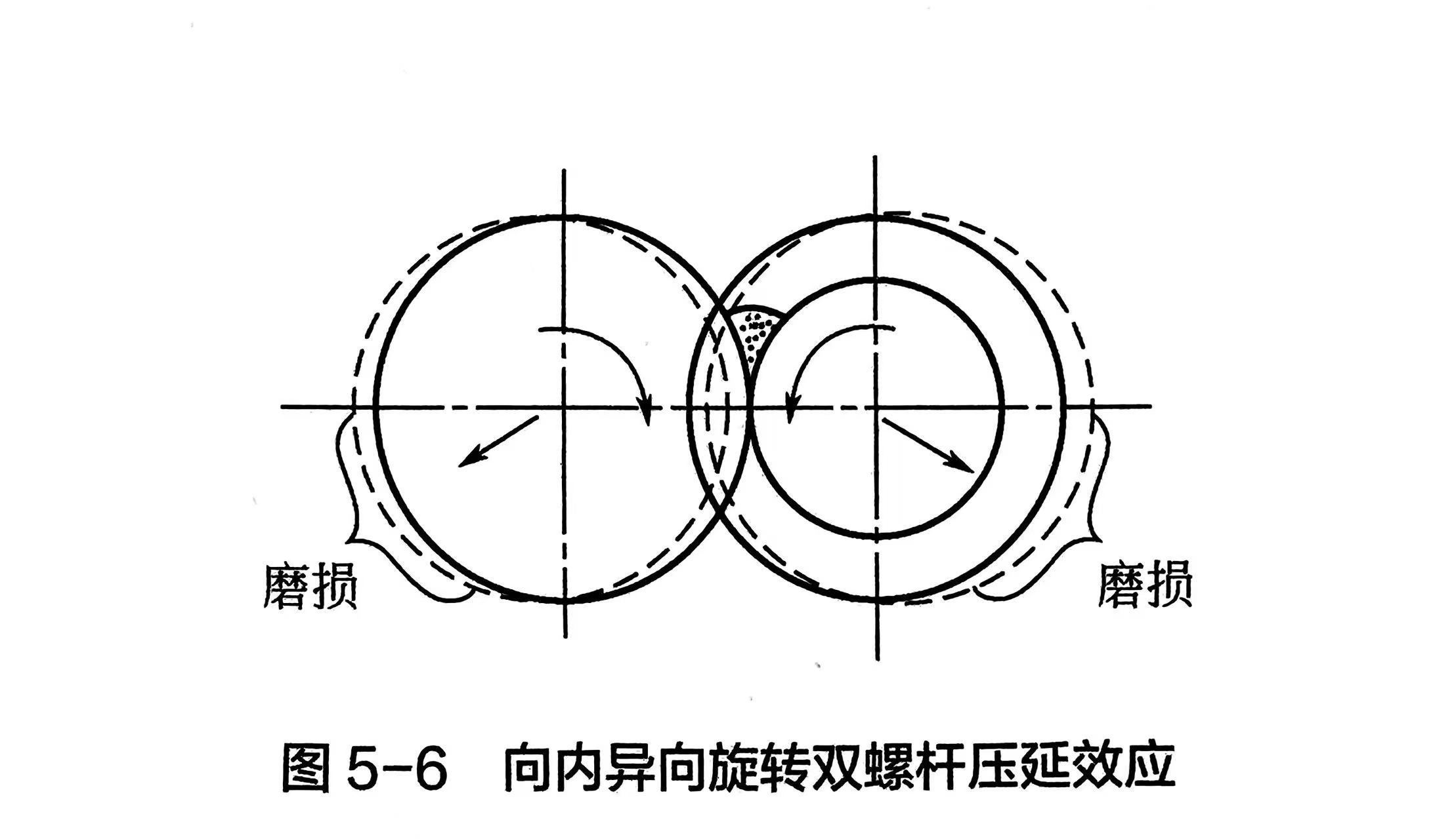 物料随螺杆的旋转在通过啮合区的间隙时,对螺杆产生巨大的分离力使进入间隙的物料产生辊压和剪切作用,这种作用称为“压延效应”,如图5-6所示。这种“压延效应”一方面提高了物料的塑化、混合质量;另一方面又容易加剧螺杆与机筒的磨损,且螺杆转速越高,磨损越严重。因此,啮合型异向旋转平行双螺杆挤出机的螺杆转速n较低,一般低于 60t/min。不难看出,向内异向旋转双螺杆“压延效应”较向外异向旋转更严重,这也是啮合型向内异向旋转双螺杆挤出机在实际生产中很少应用的重要原因。