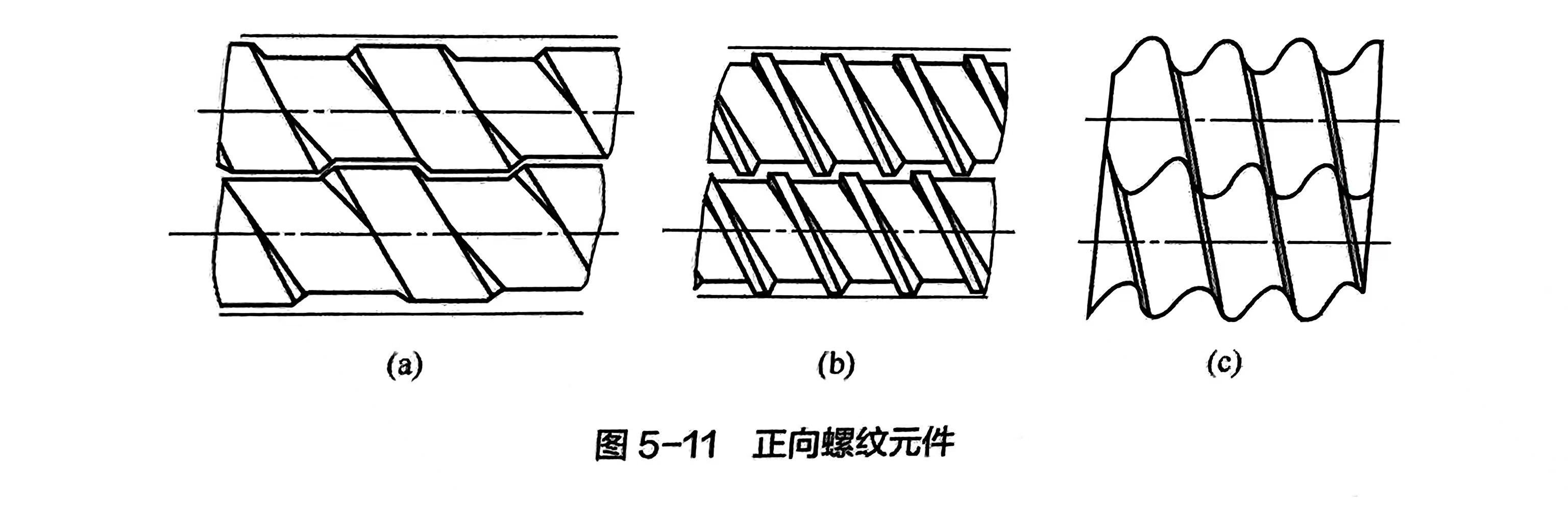 正向螺纹元件的输送方向与挤出方向相同,右旋R,一般不需要标注,如56/56、72/72、56/28等。图5-11(a)所示为近似矩形螺纹元件,其特点是螺槽和螺棱宽度接近相等,主要用于输送物料及需要在较短的轴向距离内克服由剪切元件和混合元件产生的阻力。图5-11(b)所示为近似矩形的、纵横向都开放且纵向开放较大的正向螺纹元件,其特点是螺棱比螺槽窄得多,因而在一根螺杆的螺棱和另一根螺杆的螺槽之间有很大空隙,通过这些空隙,物料可以交换。这种形式的螺纹元件具有很好的轴向混合作用,但因漏流大,输送作用减弱,物料停留时间也加长。图5-11(c)所示根据相对运动原理生成的自扫型螺槽形状的输送元件,纵向开放、横向封闭,是目前最流行的。它具有较强的输送作用,物料在其中的停留时间短,自洁性好,可在短的轴向距离建立高压,但混合性能较差。