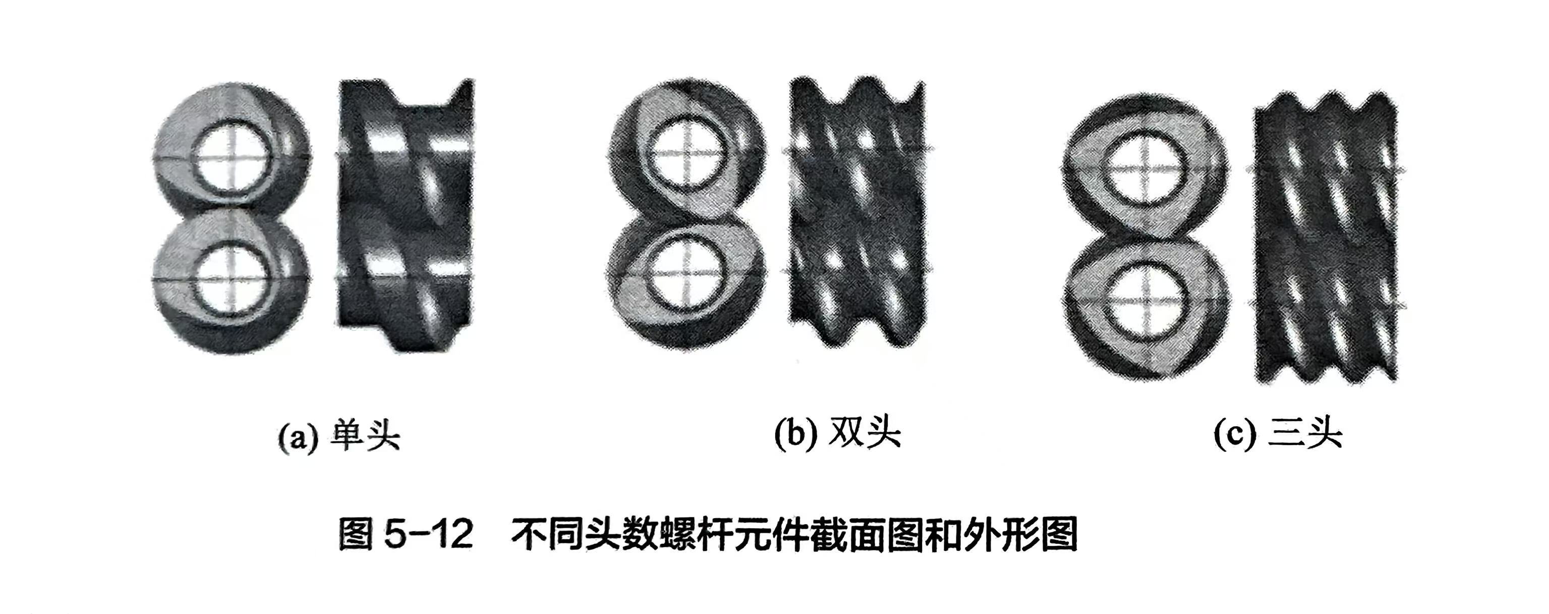单头螺杆元件,如图5-12(a)所示,具有高的固体输送能力,多用于加料段,以改进挤出量受加料量的限制以及用于输送那些流动性差的物料。当其用于泵送熔体时,由于螺棱较厚,可阻止物料通过螺棱的漏流,使泵送段的回溯长度变短。单头螺纹元件的一个缺点是由于螺棱宽,与机简内壁接触面积大,因而磨损大,且物料的受热不均匀。