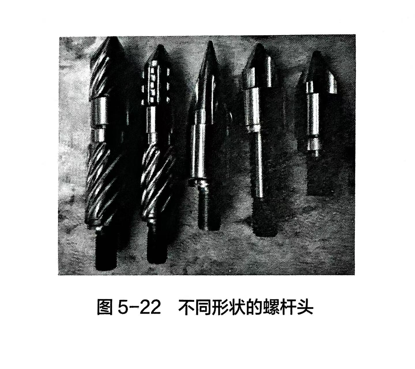 螺杆头的形状有锥形的(标准型)、偏心锥形的,还有特殊形状的(图5-22)。螺杆头与螺杆元件接触的一面必须垂直于螺杆轴线,以保证整个面与螺杆元件端面紧密贴合。与芯轴相连的螺栓,其螺纹旋向应与螺杆旋转方向相反,以便螺杆工作时,在物料阻力下,使二者越拧越紧而不松脱。也可在螺杆头与螺杆元件之间加上盘状弹簧垫,拧紧后保持一定的弹性变形,以补偿芯轴和螺杆元件之间因温度变化造成的松动。