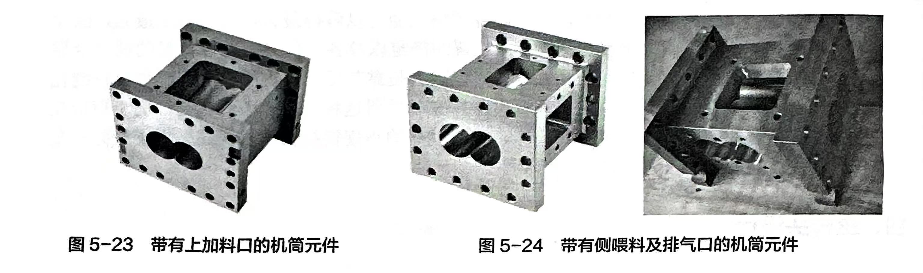 如图5-23所示,其功能是加入物料,有多种形式,由上向下看,加料口的形状多为长方形,也有圆形和椭圆形,这种上方带加料口的机筒元件可用在第一加料处,也可用在下游加料处。