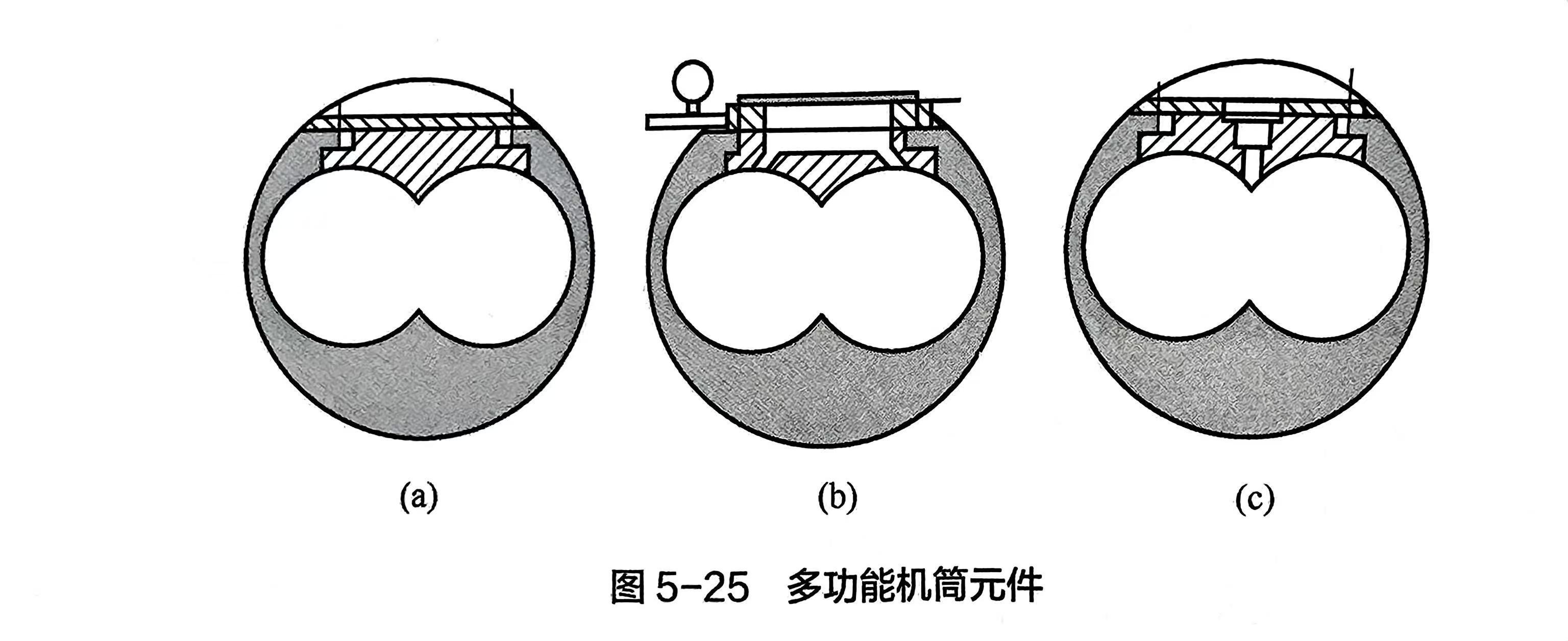 图5-25所示为在同一机筒元件上通过更换塞子实现多种用途的机筒元件。其中图(a)为将开口全部堵死,用于完全封闭机简段的情况:图(b)为装有通道的、用于排气的机段;图(c)为在塞子上开有注入孔,用于注入液体的机筒段。