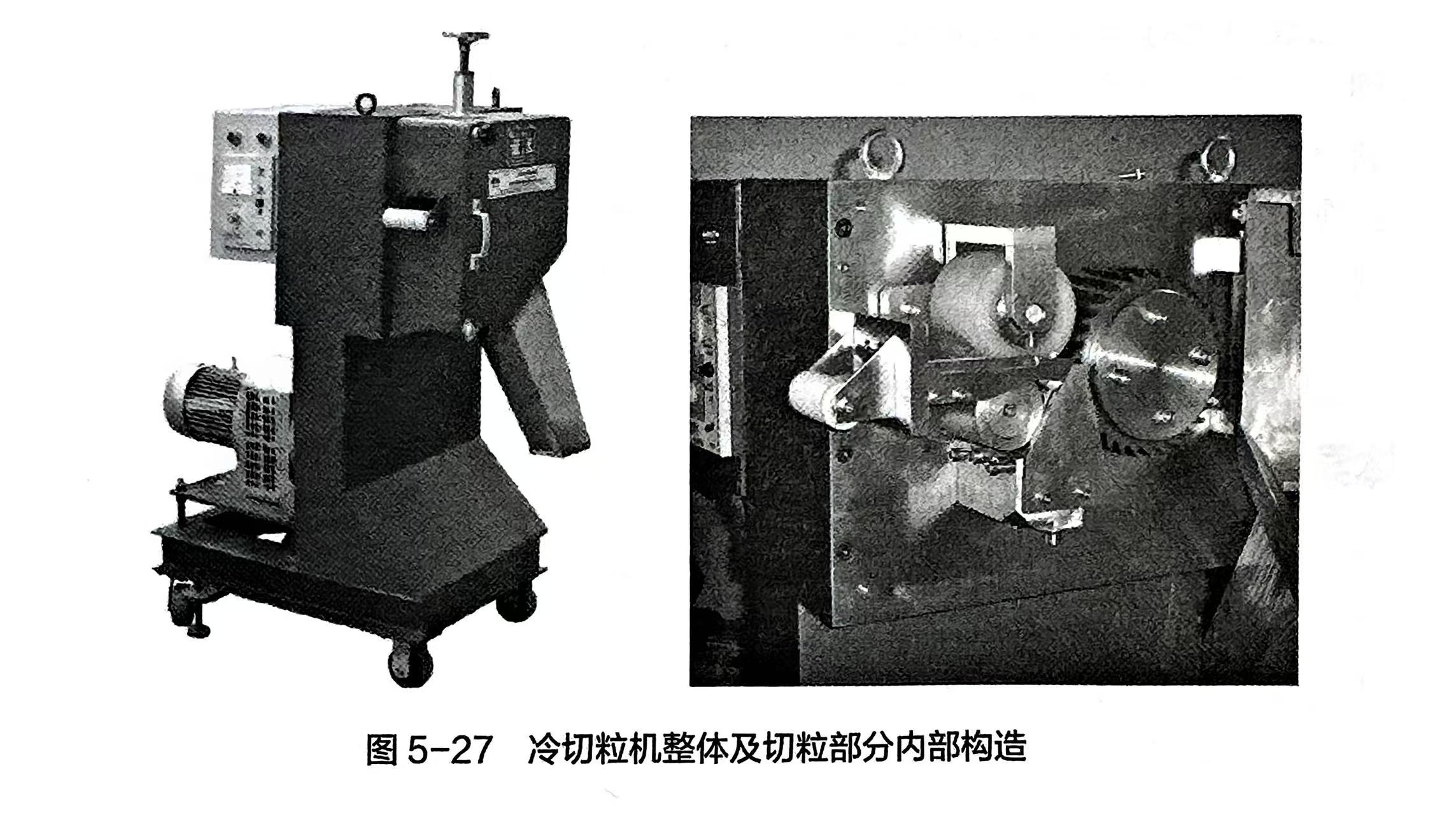 冷切是指经挤出机混炼塑化后的料条从机筒前的机头出来后进入水槽冷却,经脱水风干后,通过夹送辊按一定的速度牵引并送到切粒机中,在切刀的作用下,切成一定大小的圆柱粒状料。