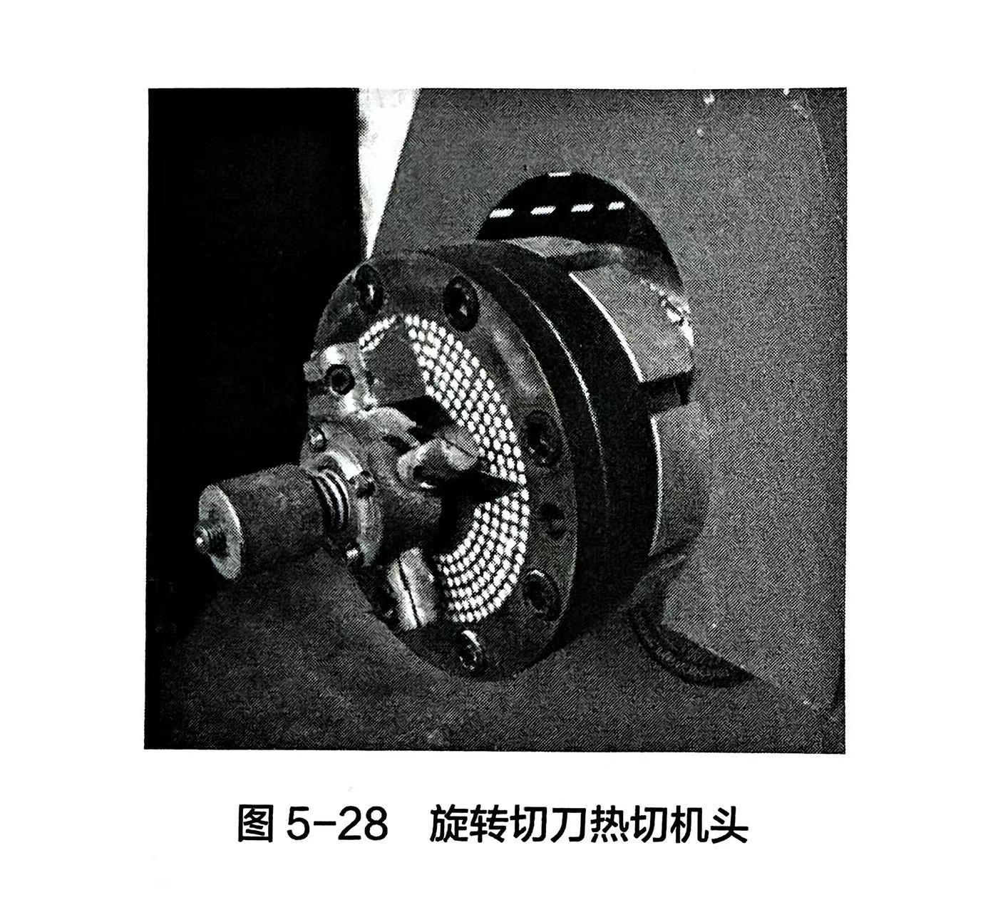 热切粒是在熔体从机头挤出后,直接送入与机头端面相接触的旋转刀而切断,切断的粒料输送并空冷或落入流水中进行水冷,这个过程属于热切造粒。旋转刀切热切机头如图5-28所示。结构简单,安装操作简便,但颗粒易发生粘连。而热切又可分为干切、水环切和水下切等几种方式,它们的具体工作方法与应用特点如下。