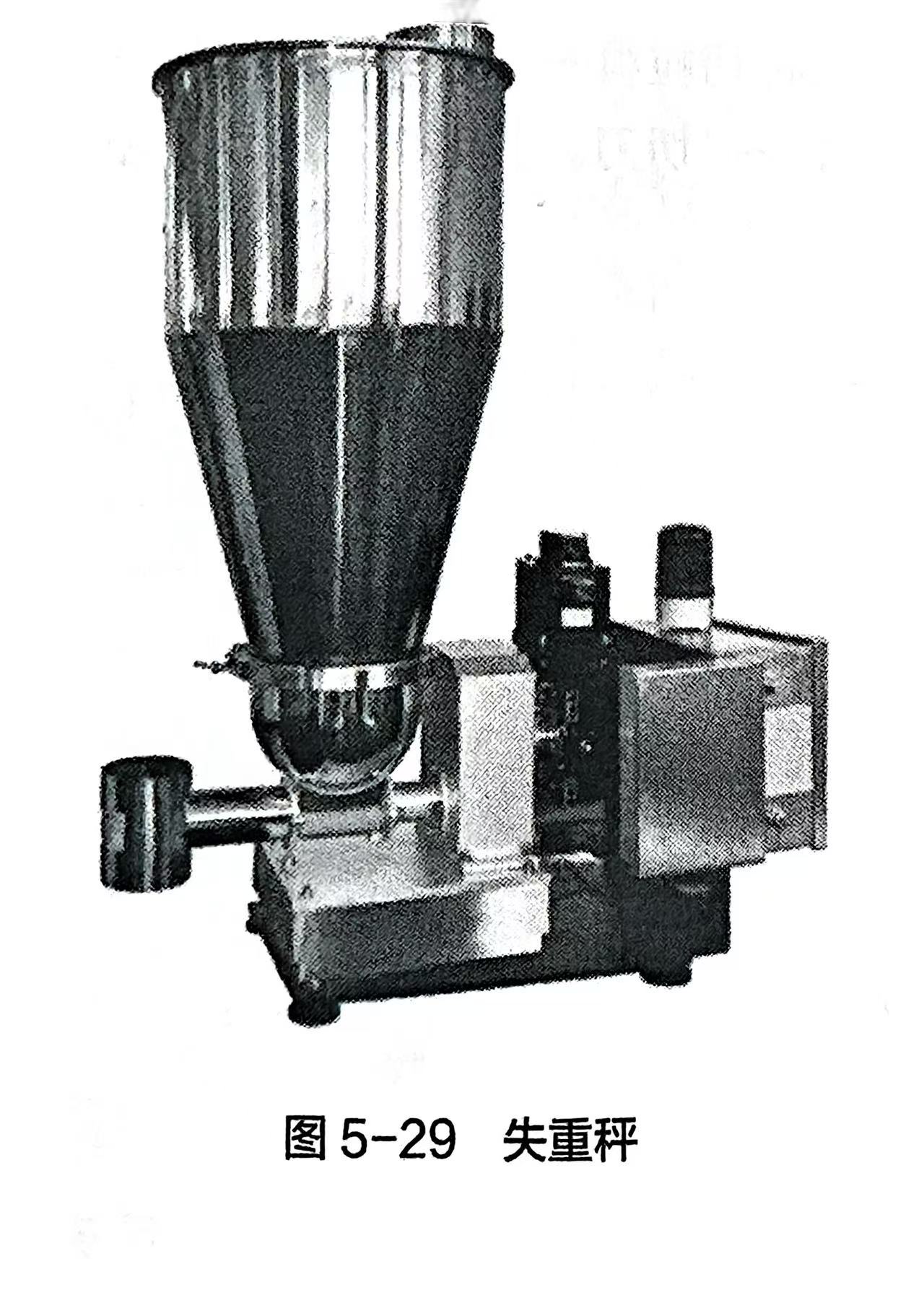 失重式喂料机由料斗、喂料器(单、双轴螺旋喂料器)、称重系统和调节器组成,在操作中,料斗、物料和喂料器共同连续地进行称重。随着物料送出后,测量真实的失重速率,并将它与所需要的失重速率(设定值)加以比较。通过调节喂料器速率来自动修正偏离设定点的偏值,从而可以均匀准确地连续喂送料。作为一种间断给料连续出料的称重设备,由于失量控制是在料斗中进行,可达到较高的控制精度,结构又易于密封,故在粉料控制时与用螺旋秤相比是一大提高。失重秤实物图如图5-29所示。