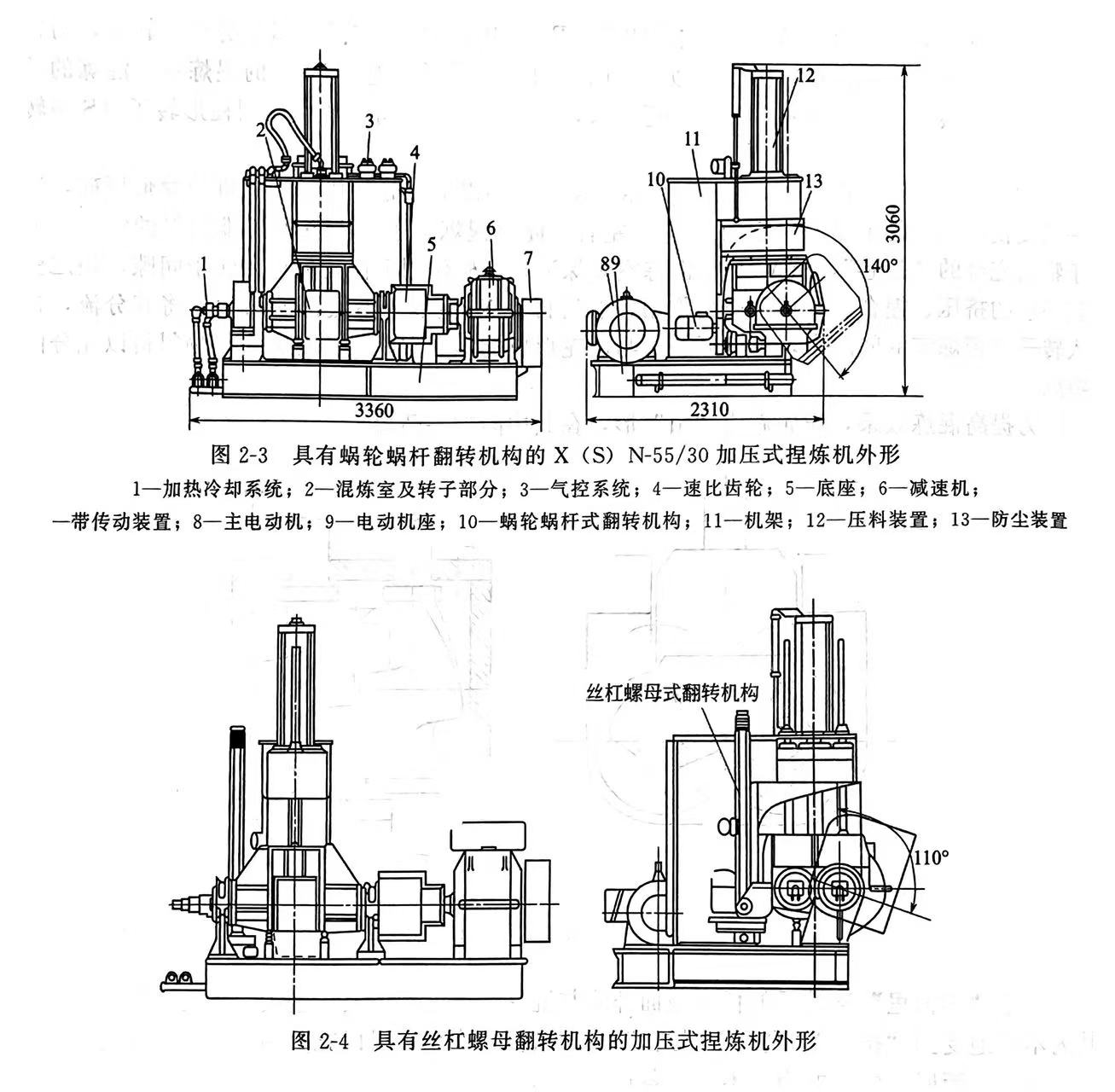 加压式捏炼机的总体结构如图2-3及图2-4所示。该机主要由压料装置、捏炼部件、主传动系统、加料装置、翻转机构、加热冷却系统、气控系统、机架、底座及电控系统等组成。