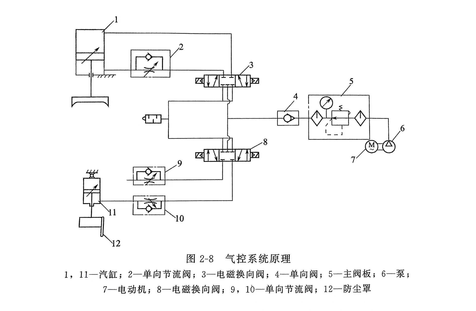 气控系统主要由空气过滤器、调压阀、油雾器以及各类阀与压砣加压气缸及防尘罩气缸组成回路控制速度及压力,如图2-8所示。