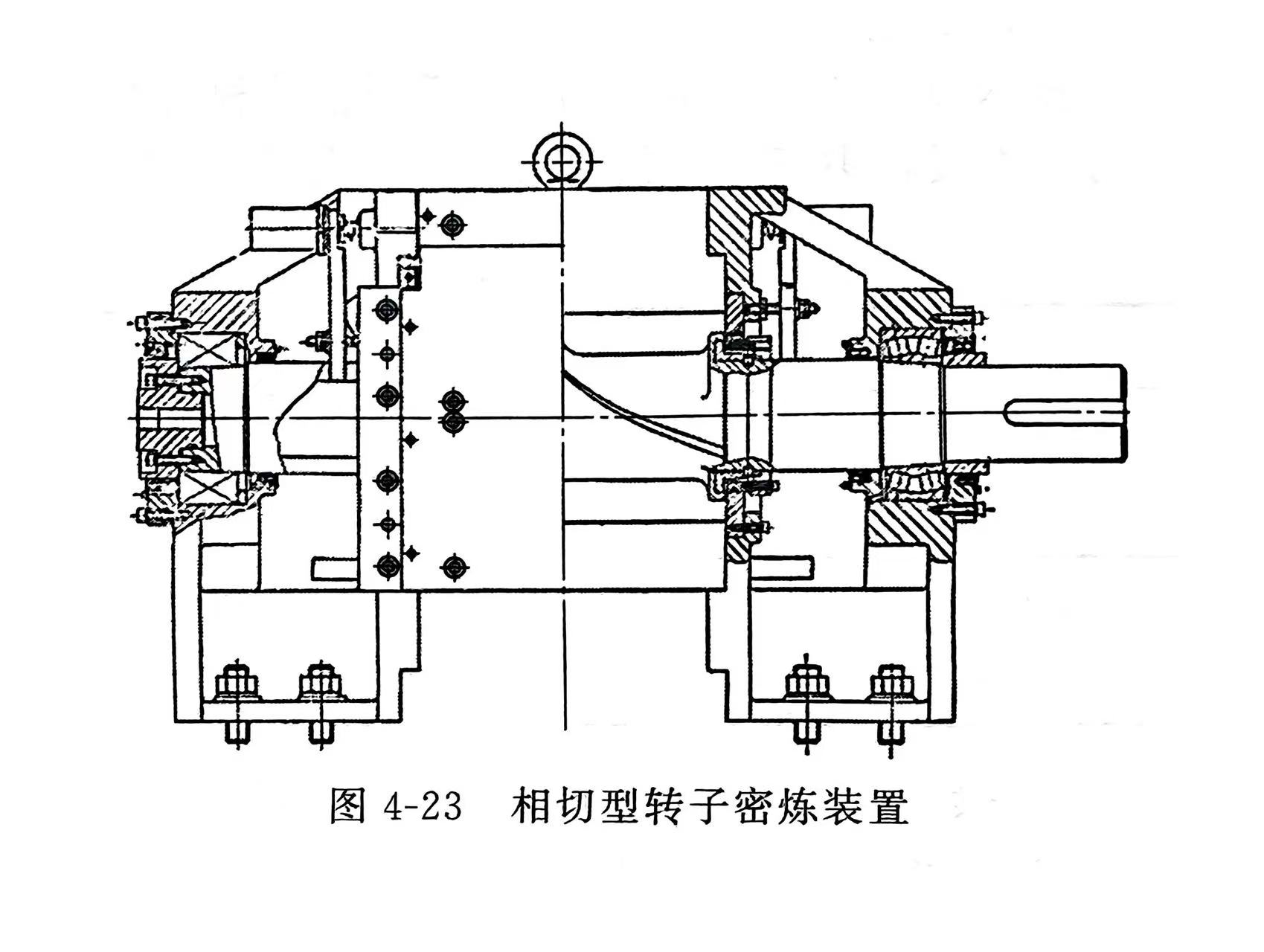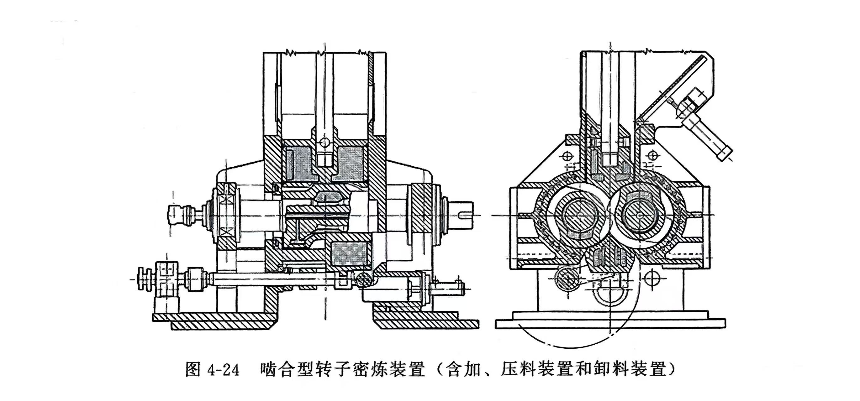 密炼装置的密炼室内装一对转子,分别支承在两个滚子轴承上。转子伸出密炼室的侧面壁处装有转子端面密封防止物料漏出。转子和密炼室都通有控温用载体(蒸汽、水、油等),物料在密炼室内混炼。密炼室上部有进料口,其上装有加料装置和压料装置。下部有卸料口,并装有卸料装置。