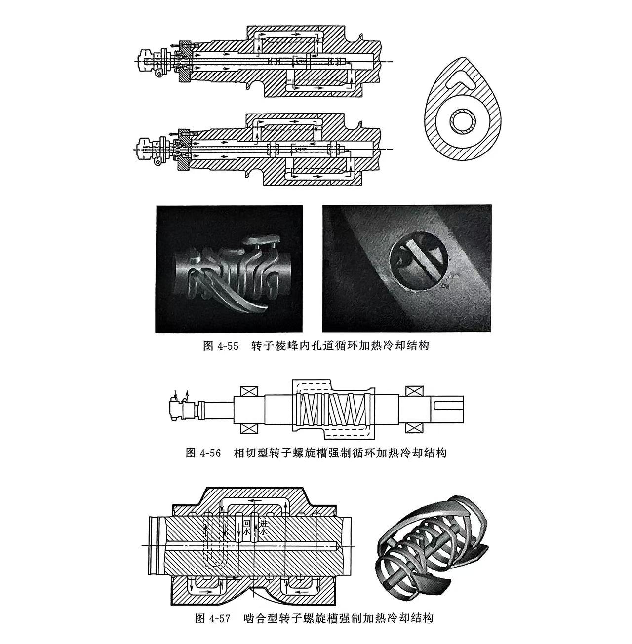 相切型转子螺旋槽强制循环加热冷却结构如图4-56所示。图4-57为啮合型转子螺旋槽强制加热冷却结构示意图。
