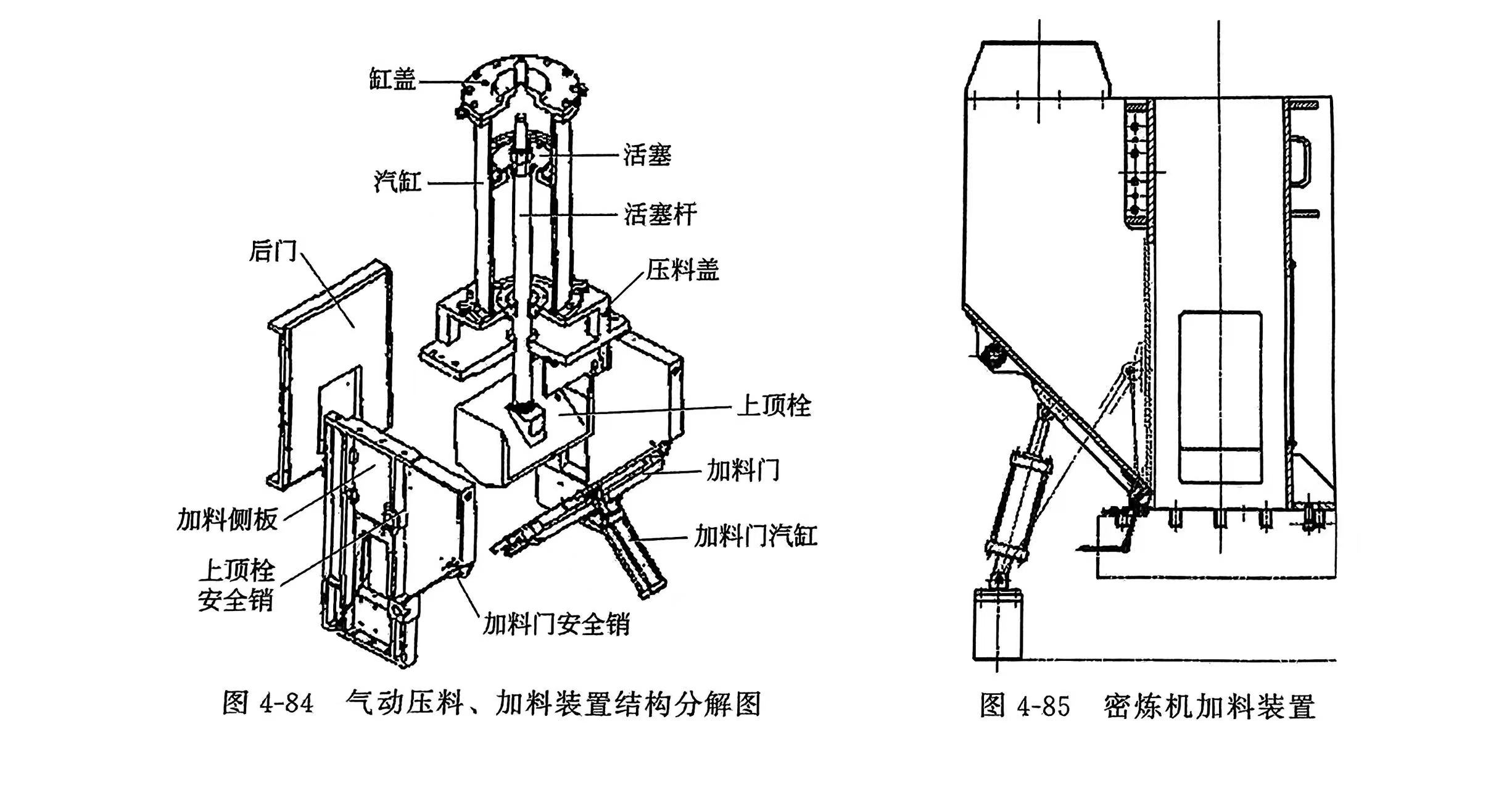 加料装置的基本结构如图4-84所示,加料装置位于密炼机压料装置下边,坐落在密炼室之上。