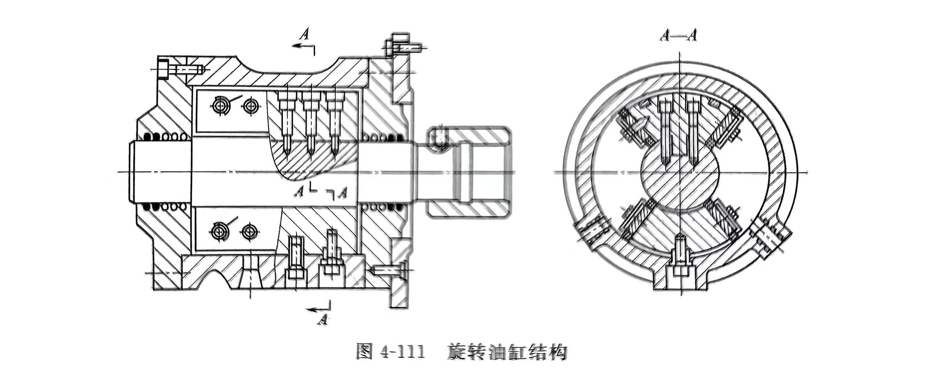 旋转油缸结构如图4-111所示。依靠压力油的压力推动转动块在油缸内转动,当压力油在转动块两侧轮换注入时,则形成转动块绕油缸中心旋转轴的摆动动作,其输出轴就显现为正反转,拖动与之相连的卸料门轴正反转,当正反转的角度设计准确后,即可保证卸料门的开启和关闭动作。