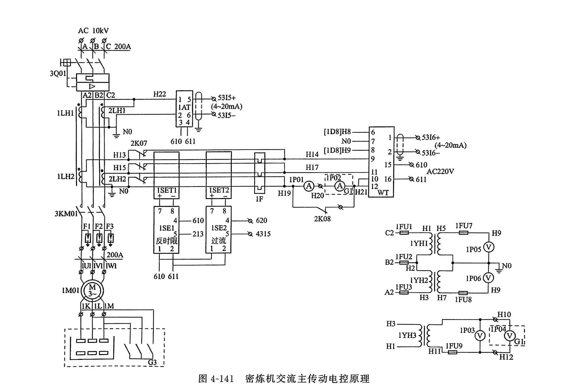 同样交流传动也需针对主电动机的技术特性实施控制方案。如所选用的主电动机的功率、转速、电压(大功率交流电动机通常 AC6000V 或 AC1OkV)、冷却方式(大功率交流电动机通常为空水冷却)、高压主回路设有隔离开关和真空接触器、保护回路需设有过电流(瞬态、反时限)、欠压保护和高压电机启动方式,采用转子串频敏变阻或采用液体电阻降压启动方式等,如图4-141所示。